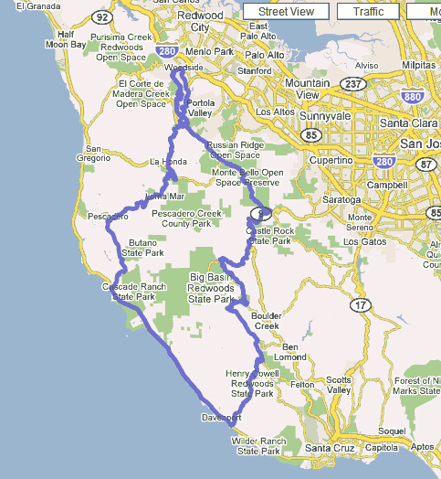 Highway 9 to Skyline, Skyline north to Sky Londa and back down to Woodside.