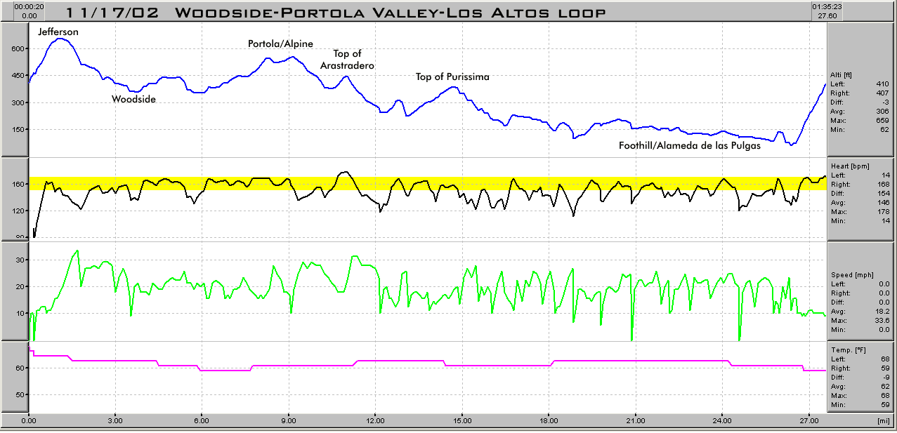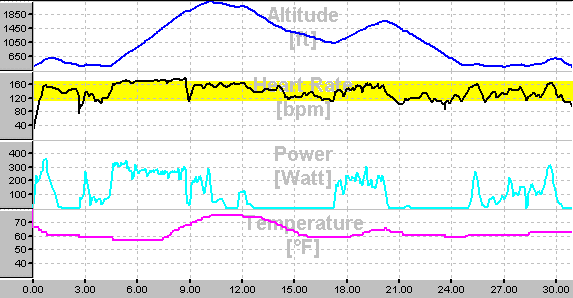 a heart monitor (the Ciclomaster Hac-4), I tried to keep my pulse below 160,