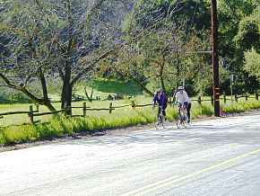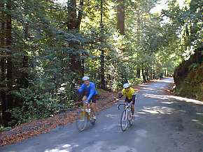 A couple riders enjoying great weather on our local favorite, known as The Loop. Many variations exist, from as few as 15 miles to our special-edition extended version that takes you up to Skyline Blvd via Old La Honda Road! All versions take you through the Portola Valley, Woodside & Stanford areas. |