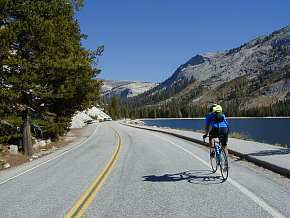 If this photo doesn't make you want to get out on your bike and explore the Sierras, nothing will. The road from Crane Flat to Tioga Pass in Yosemite offers spectacular views, relatively easy grades, thin air (tops out at 9,945 feet) moderate traffic. This is a great weekday or late-season (October) ride. |
