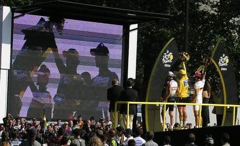 Elysees, with Lance Armstrong first, Kloden second and Basso third.