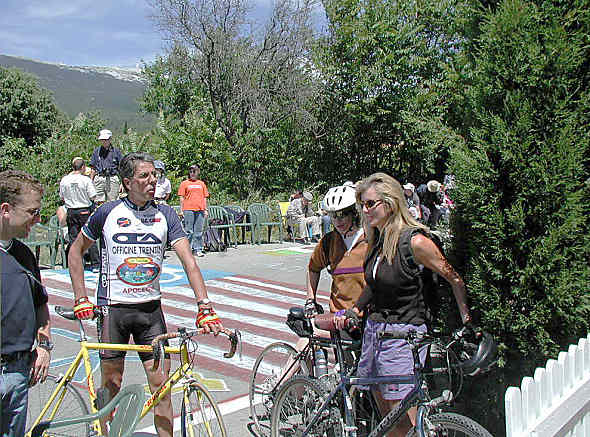 This year, over 7,000 people decided to try test themselves against what many believe to be one of the toughest climbs anywhere...Mont Ventoux. The mountain itself doesn't seem that ominous...about 6100 feet at the top, somewhere around 800 feet at the base, and 21 kilometers (13 miles) in length. Big deal...Mt Hamilton is an 18 mile climb! True enough, but Mt. Hamilton only goes up 4,000 feet in those 18 miles.